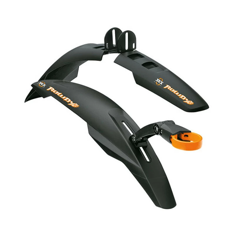 Cooles MTB Dirtboard-Set für coole Kids: Mit dem SKS Schutzblech ROWDY aus schlagfestem Hochleistungskunststoff werden auch die Kleinen vor Spritzwasser geschützt. Die geteilte Ausführung des Vorderrad-Schutzbleches macht die Befestigung noch flexibler.